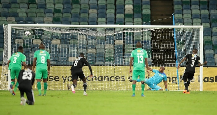 Thembinkosi Lorch of Orlando Pirates score a penalty during the 2020 MTN8 final match between Bloemfontein Celtic and Orlando Pirates at Moses Mabhida Stadium, Durban, on 12 December 2020 ©Samuel Shivambu/BackpagePix