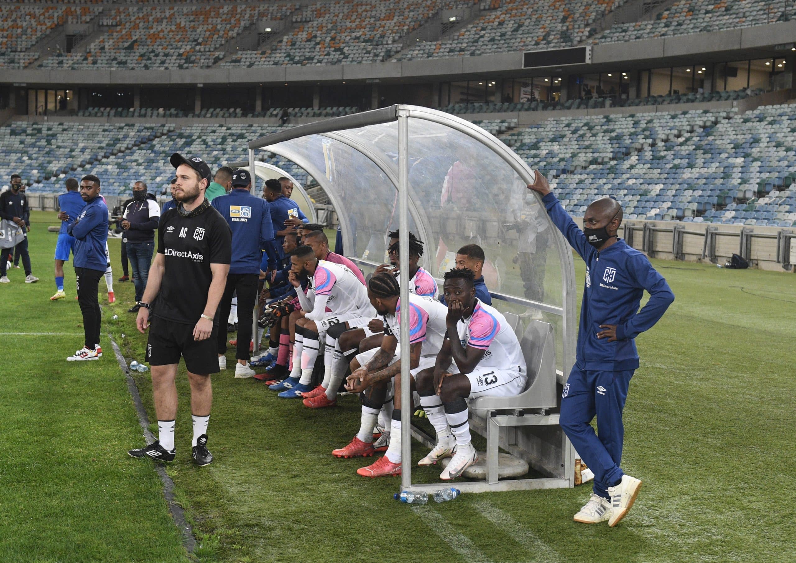 Cape Town City dejected during the 2021 MTN8 Final match between Cape Town City and Mamelodi Sundowns on the 30 October 2021 at Moses Mabhida Stadium, Durban Pic Sydney Mahlangu/BackpagePix