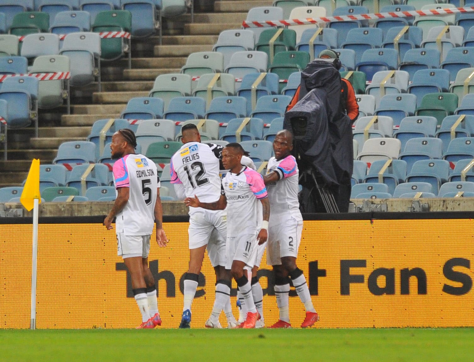 Fagrie Lakay of Cape Town City celebrates goal with teammates during the 2021 MTN8 Final match between Cape Town City and Mamelodi Sundowns on the 30 October 2021 at Moses Mabhida Stadium, Durban Pic Sydney Mahlangu/BackpagePix