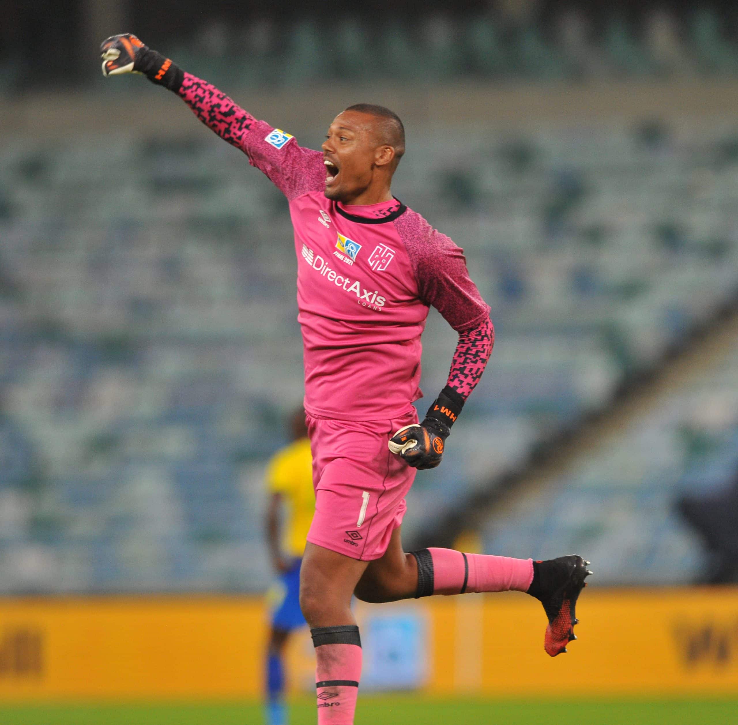 Denis Onyango of Mamelodi Sundowns celebrates saving a penalty during the 2021 MTN8 Final match between Cape Town City and Mamelodi Sundowns on the 30 October 2021 at Moses Mabhida Stadium, Durban Pic Sydney Mahlangu/BackpagePix