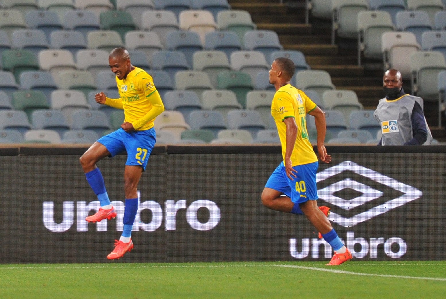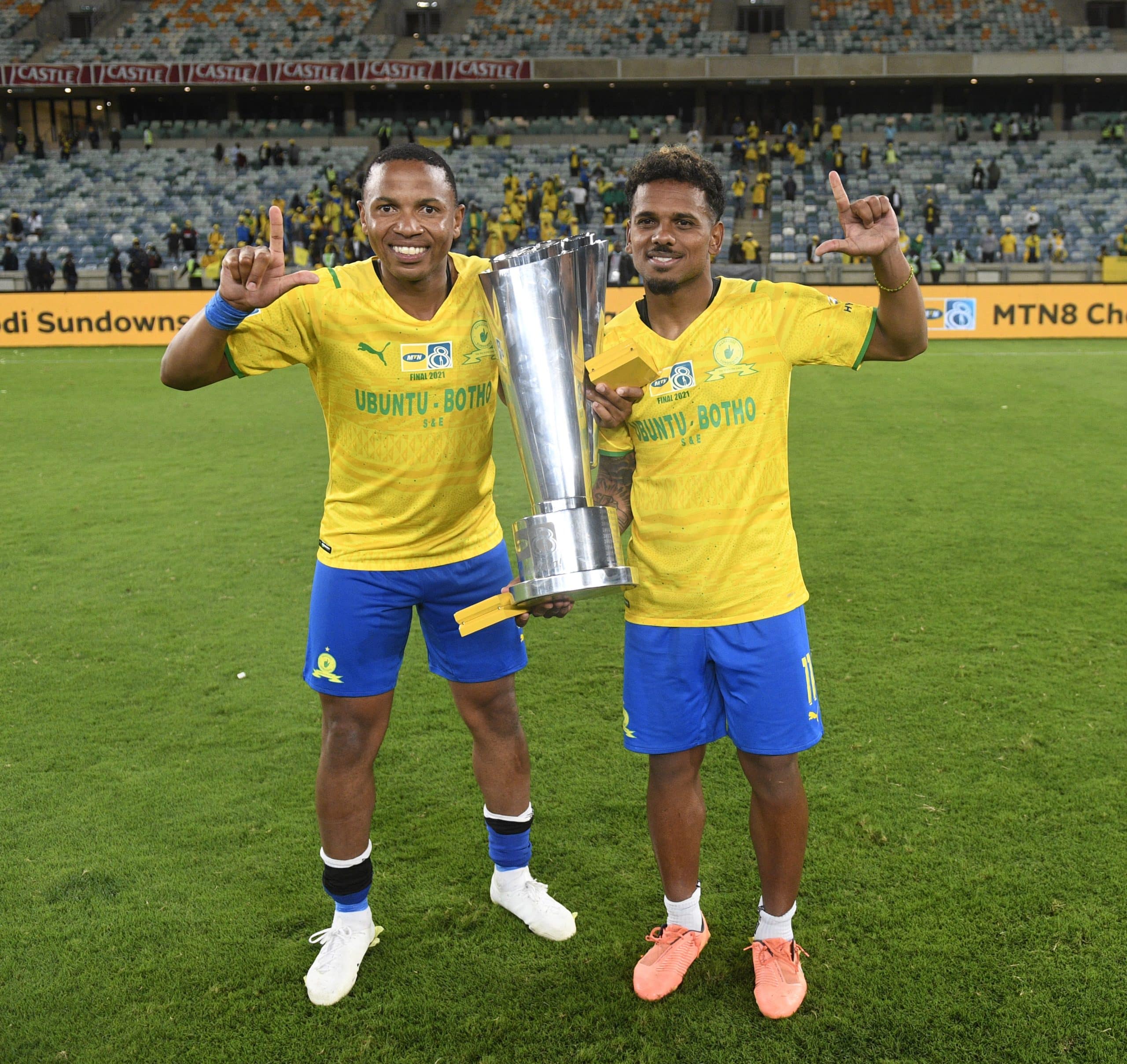 Andile Jali and Kermit Erasmus of Mamelodi Sundowns celebrates during the 2021 MTN8 Final match between Cape Town City and Mamelodi Sundowns on the 30 October 2021 at Moses Mabhida Stadium, Durban Pic Sydney Mahlangu/BackpagePix